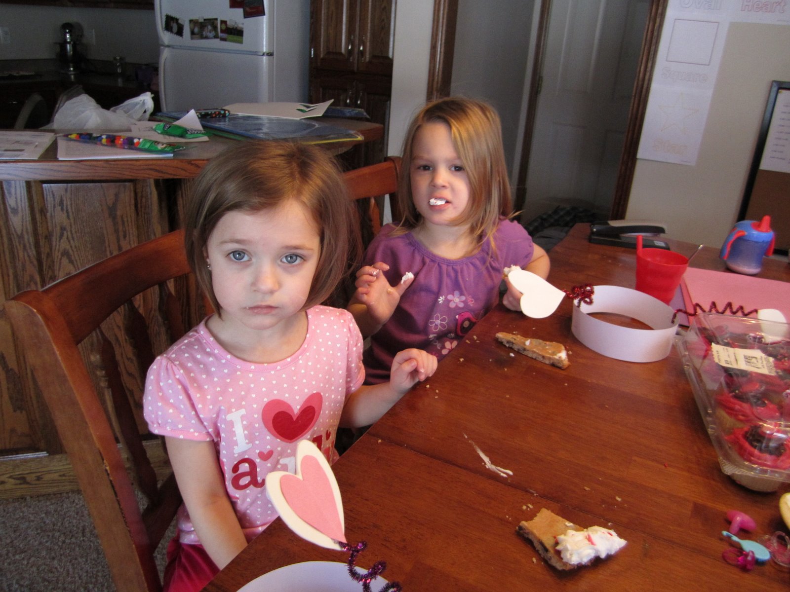 The next day...Valentine's Day...we had a party with the daycare kids. They had a blast! We made cookies and hats, had cupcakes, and traded valentines.